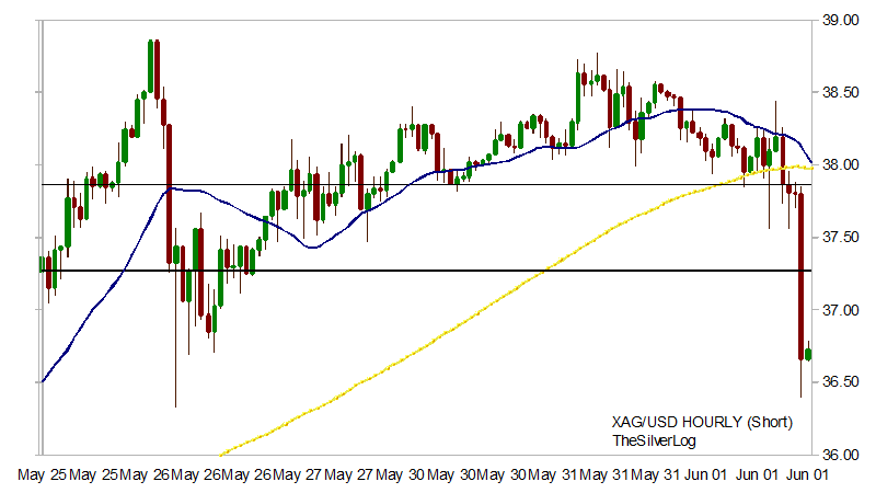 The five day moving average is now declining but will not consider this a bear market until the support level at 36.25 with a confirmed breakdown. If it holds this level then this will either mean the market to go neutral and thus the five day average will trade sideways as well or it will get back above the five and reverse back to the upside and thus making todays selling a failed move technically speaking. Still kind of sickening that we have to rely on a market that is so heavily manipulated or far free having free price movements. In my opinion the only way this should be traded, is by trading silver. This means to buy you either take the lowest ask price offered or put a bid order in yourself and wait. If you want to sell then choose the bid price offered or put an ask order in and make sure you have the silver in some sort of NON FRACTIONAL bank that has the silver or you can deliver to the bank. When you consider we have many millions traded per day the same silver can be swapped dozens of times per day, assuming of course it is real silver. High Frequency trading can buy at 37.20 and sell it back at 37.28 two minutes later and then make these two or five or short trades hundreds of times per day. This is not productive for society at all in my opinion however if people are still interested in buying/selling at these levels I will continue to update these charts as people whom are selling close to spot are doing so and thus they are complying with the price controls that controls the world financial system. Thats all I got for tonight. Be back late Thursday morning either on the blog and/or youtube.END OF DAY REPORT - Article below will explain a lot of the action, but gold and silver traded different and this move was specific towards the silver market today as silver got crushed as gold went up today. Don't ya love this manipulation? We'll you don't have to, but the corruption of dollar manipulation is the reason I buy the physical. Next update will be later tonight between 11pm and 12pm est.